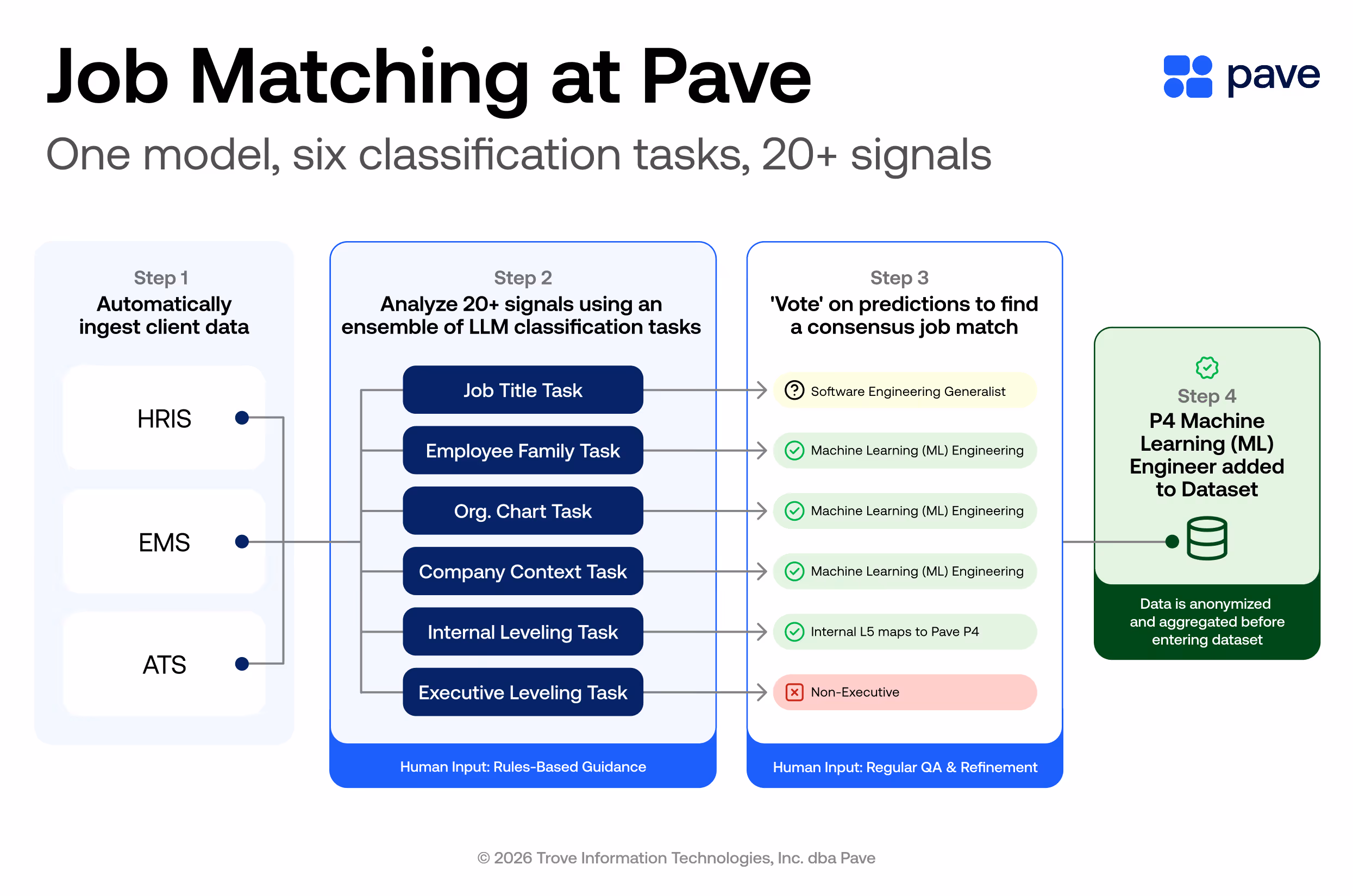 - Step 2: Analyze 20-plus signals from client systems through an ensemble of six distinct LLM classification tasks designed to match employees to Pave's job catalog.