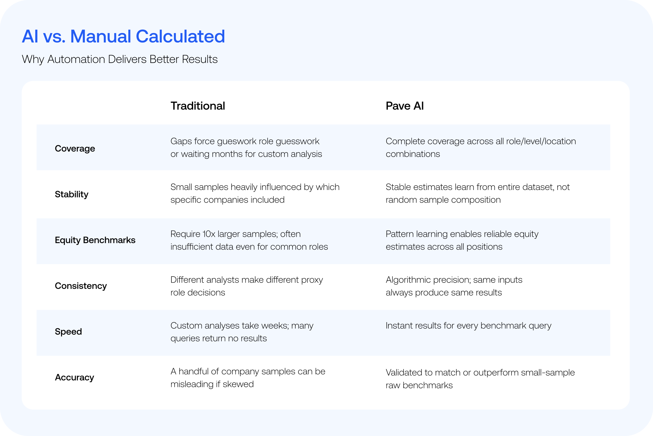 Compensation data gaps occur due to sample size limitations (especially for senior or specialized roles), emerging job families that evolve faster than survey cycles, geographic expansion into new markets, and equity data that require 10x as many data points as base salary for statistical reliability. Additionally, Pave applies strict reliability thresholds—including consistency and sample size requirements—before displaying any benchmarks. While this happens much less frequently than traditional approaches, if a benchmark does not meet these thresholds, it will not be shown to ensure that only robust, reliable market data is presented. While Pave’s calculated benchmarks leverage data more efficiently than other providers, these safeguards remain in place to maintain data quality and trust.