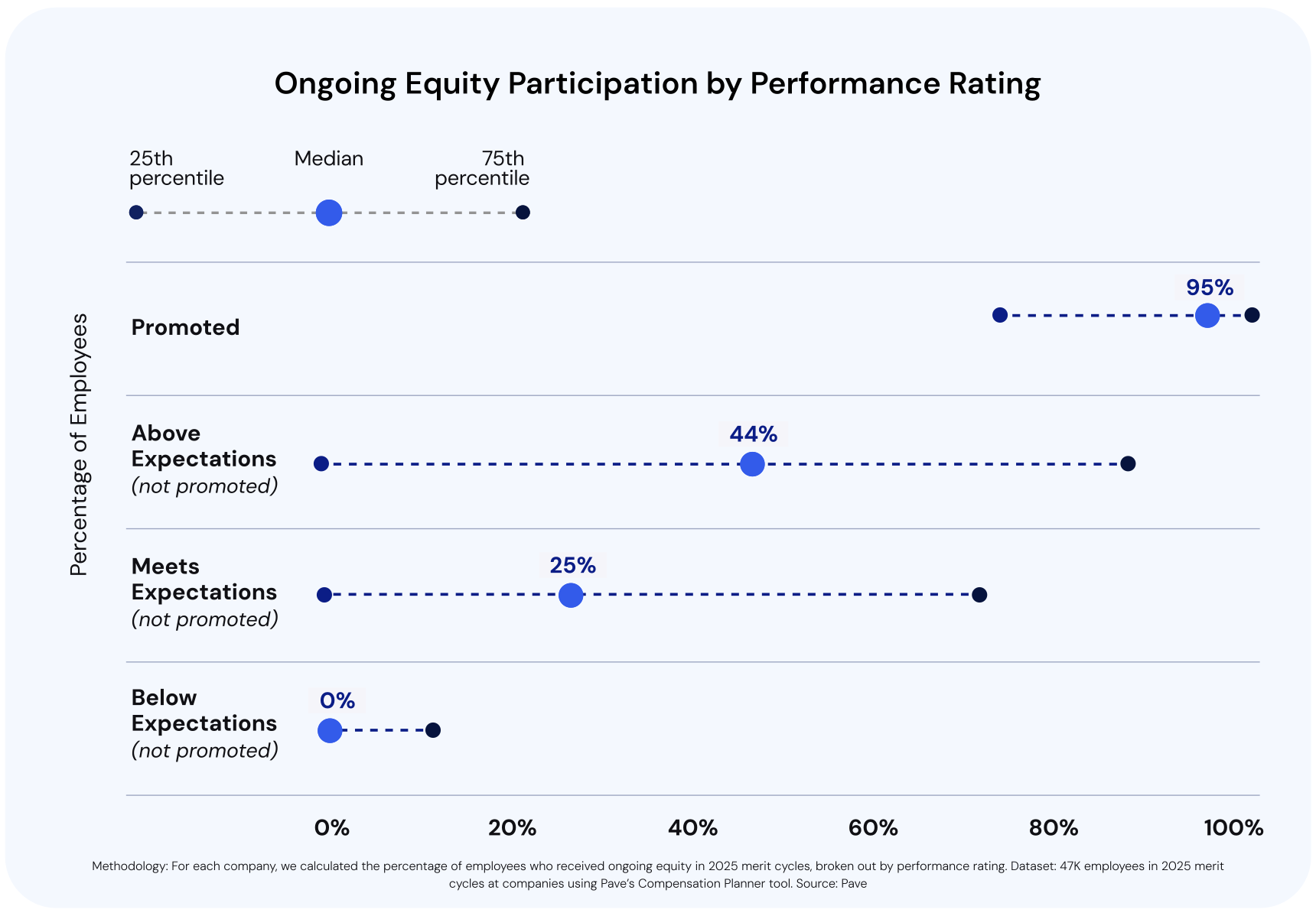 - Performance: Promotions are the strongest driver of ongoing equity grants. A median of 95% of promoted employees receive grants compared with 44% of high performers who aren’t promoted.