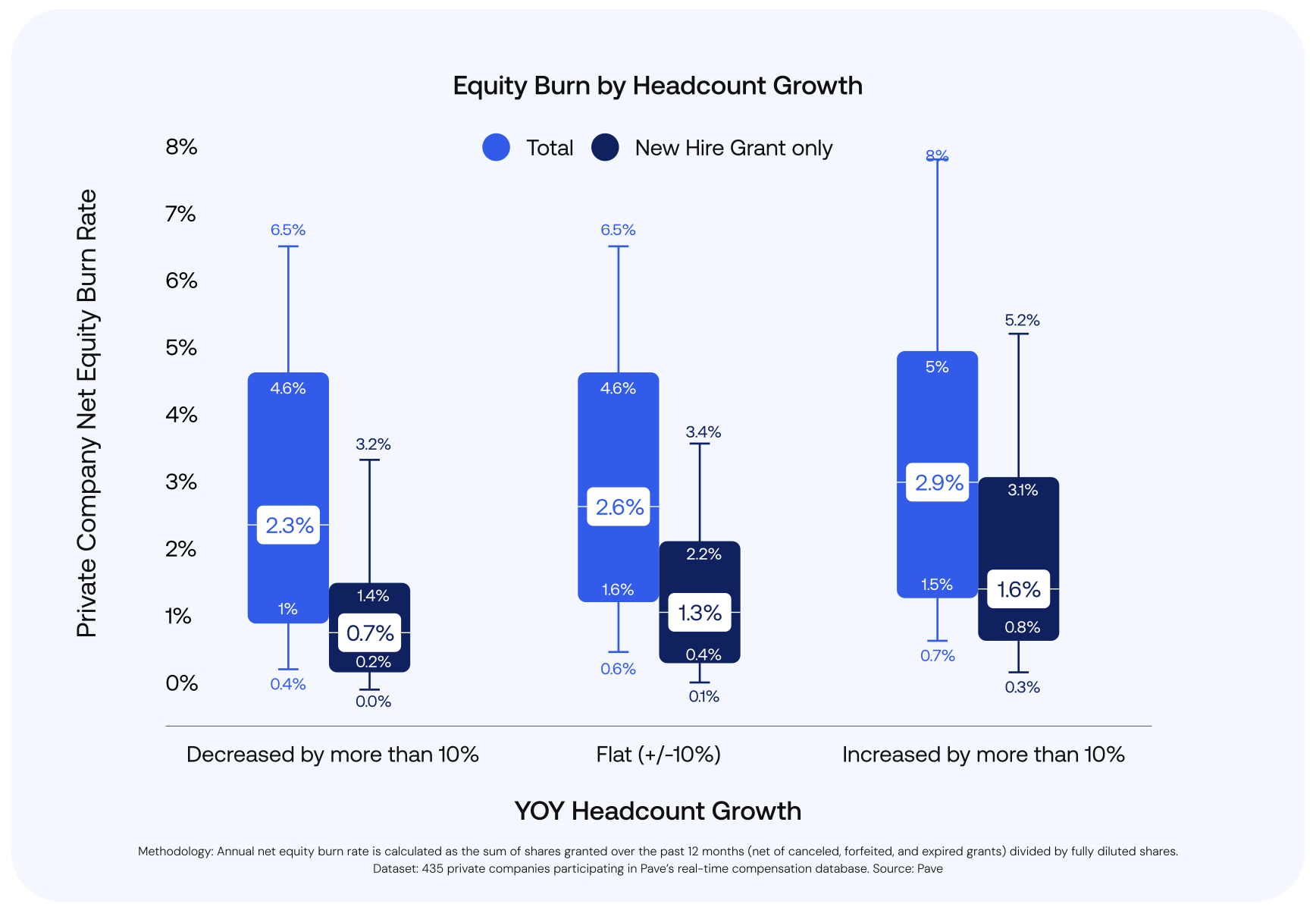 Pave's data shows that companies growing headcount by more than 10% have median total burn rates of 2.9%, compared with 2.6% for flat headcount and 2.3% for companies shrinking by more than 10%.