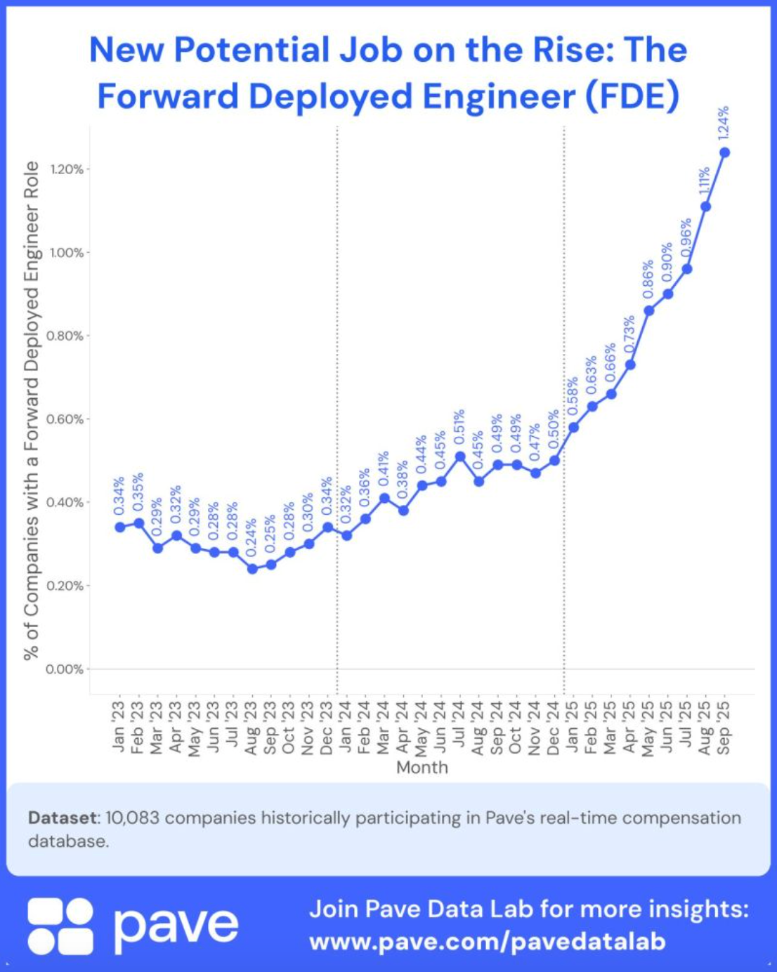 I would call out that only 1.24% of companies in Pave’s dataset (as of September 2025) have the Forward Deployed Engineer position. So, it is still somewhat of a minority in the market today. This said, I would expect the trend to continue given the “follow the leader” pattern that tends to happen with new jobs.