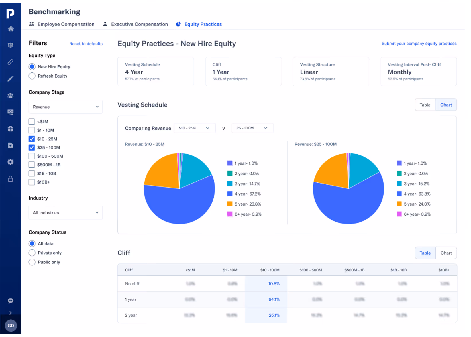 - Access equity benchmarking data that’s most relevant to your company. Benchmark against the types of companies you compete with for talent. Filter based on company type (private versus public), revenue, and more.