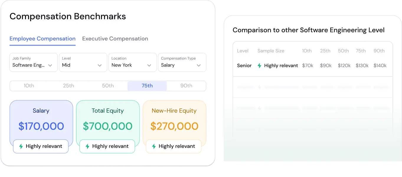 Base compensation decisions about salary, equity, and variable on real-time benchmarking data from over 7,000 integrated companies—all in one place.