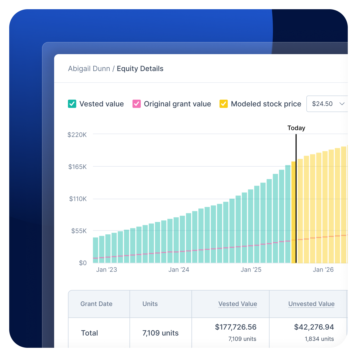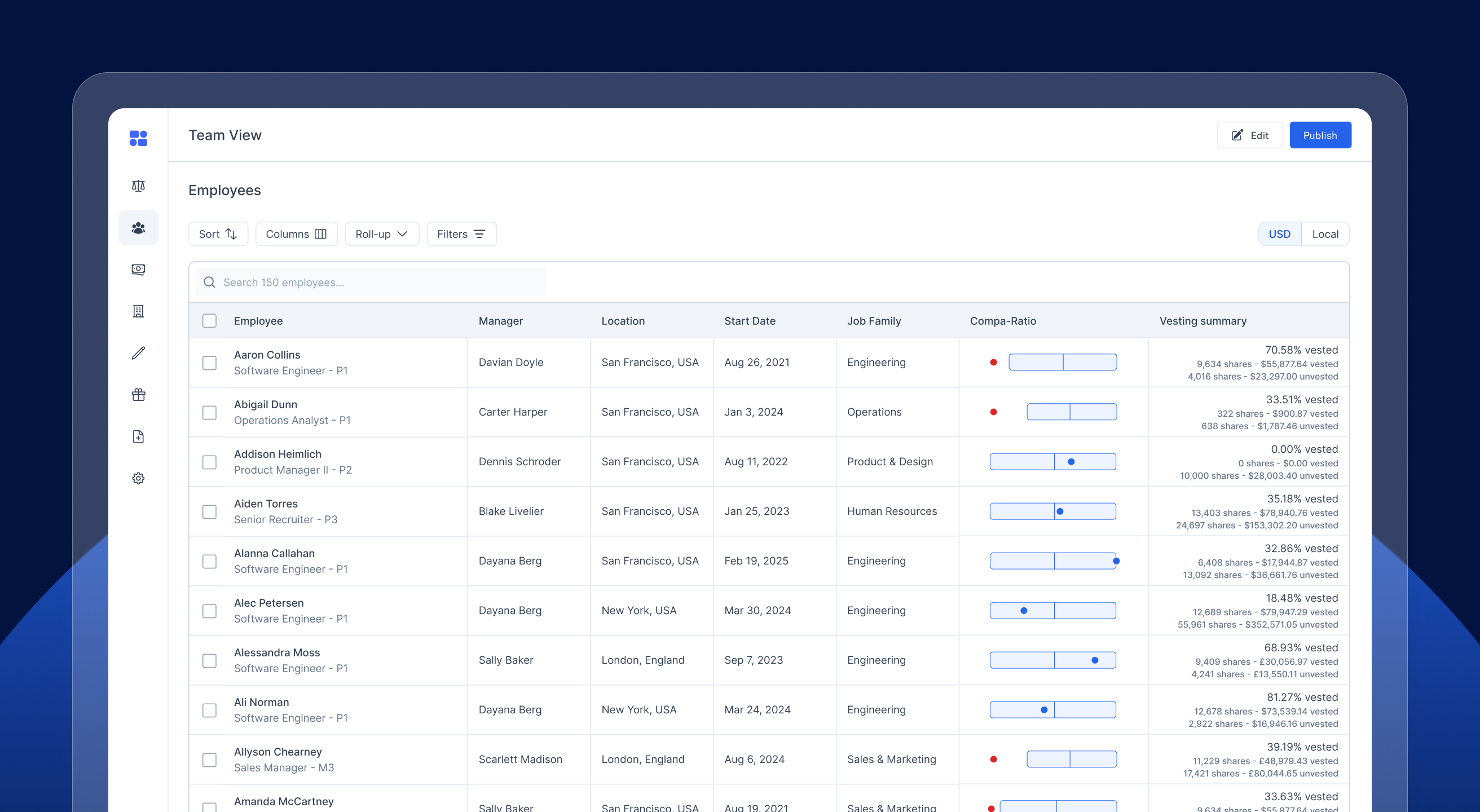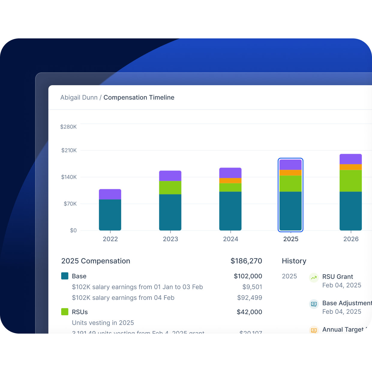 Understand total compensation for your entire employee population—without logging into multiple tools. Team View enables you to zoom in to understand any individual’s compensation timeline and vesting progress. Or, zoom out to compare individuals across salary, equity, and bonuses.